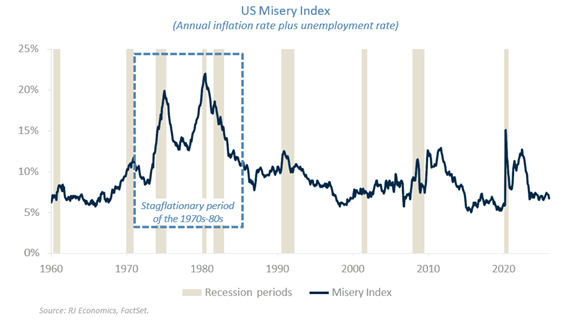 As we discuss below, the US economy is currently growing above potential, which rules out the “stagnation” component of stagflation. Inflation is indeed above the Fed’s 2% target, but nowhere near the levels of that era. Neither growth nor inflation resembles the stagflation environment of the 1970s-80s.