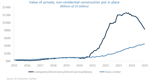 For the first time since 2023, the US economy appears to be gaining momentum across sectors. The manufacturing sector in particular has shown signs of life, posting two consecutive expansionary readings in the ISM Manufacturing PMI. While many observers credit the AI boom, the underlying driver is more structural: the CHIPS Act and the Inflation Reduction Act, which triggered a surge in manufacturing construction starting in 2021. These investments are now coming online. More recently, data center construction – boosted by AI-related demand – has added further momentum.